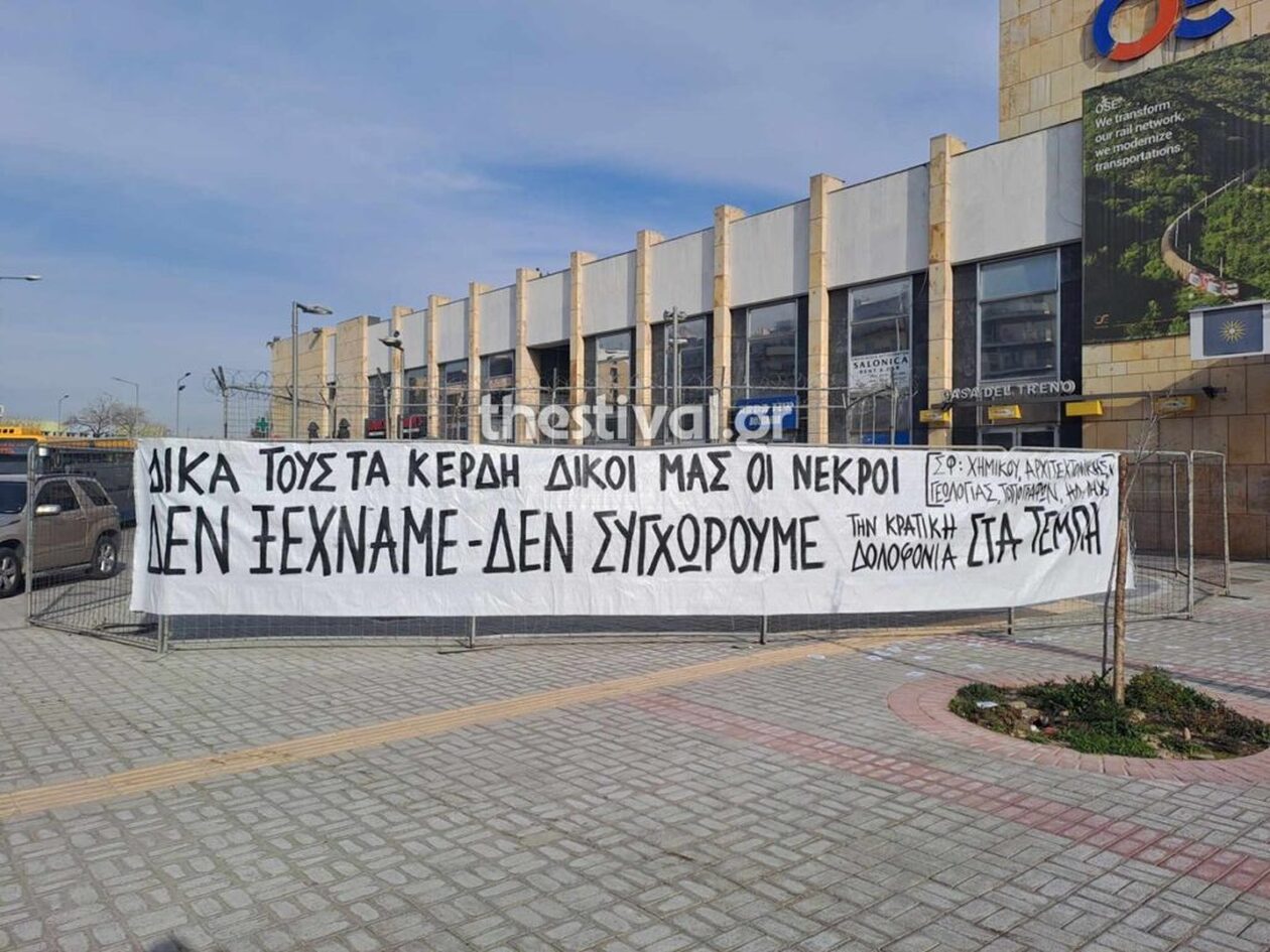 Οι φοιτητές κατά τη διάρκεια της διαμαρτυρίας τους σήκωσαν πανό που έγραφε: «Δικά τους τα κέρδη, δικοί μας οι νεκροί. Δεν ξεχνάμε – Δεν συγχωρούμε την κρατική δολοφονία στα Τέμπη».