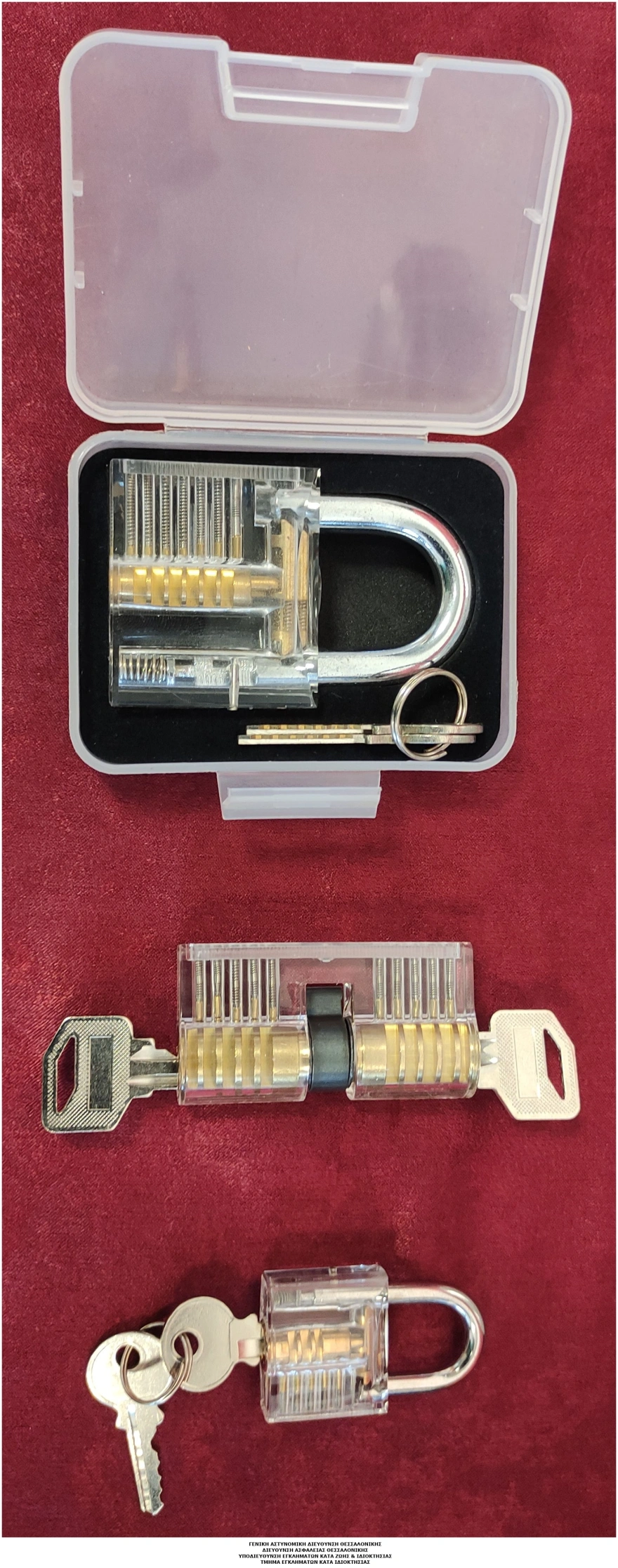 • 2 κλειδαριές – λουκέτα και 1 μύλος – κλειδαριά θύρας οικίας μαζί με κλειδιά τους, πρόσφορα για παρατήρηση – εξάσκηση τρόπου λειτουργίας και ξεκλειδώματος,
