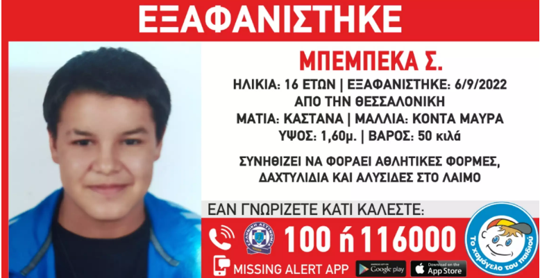 Όπως ανακοίνωσε το Χαμόγελο του Παιδιού την Τετάρτη, 23 Νοεμβρίου, ενημερώθηκε για την εξαφάνιση της Μπεμπέκας Σ., ηλικίας 16 ετών, από την περιοχή της Θεσσαλονίκης.