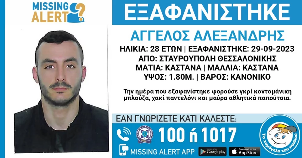 Το «Χαμόγελο του Παιδιού» εξέδωσε missing alert, για την εξαφάνιση του 28χρονου Άγγελου Αλεξανδρή από την περιοχή της Σταυρούπολης στη Θεσσαλονίκη.