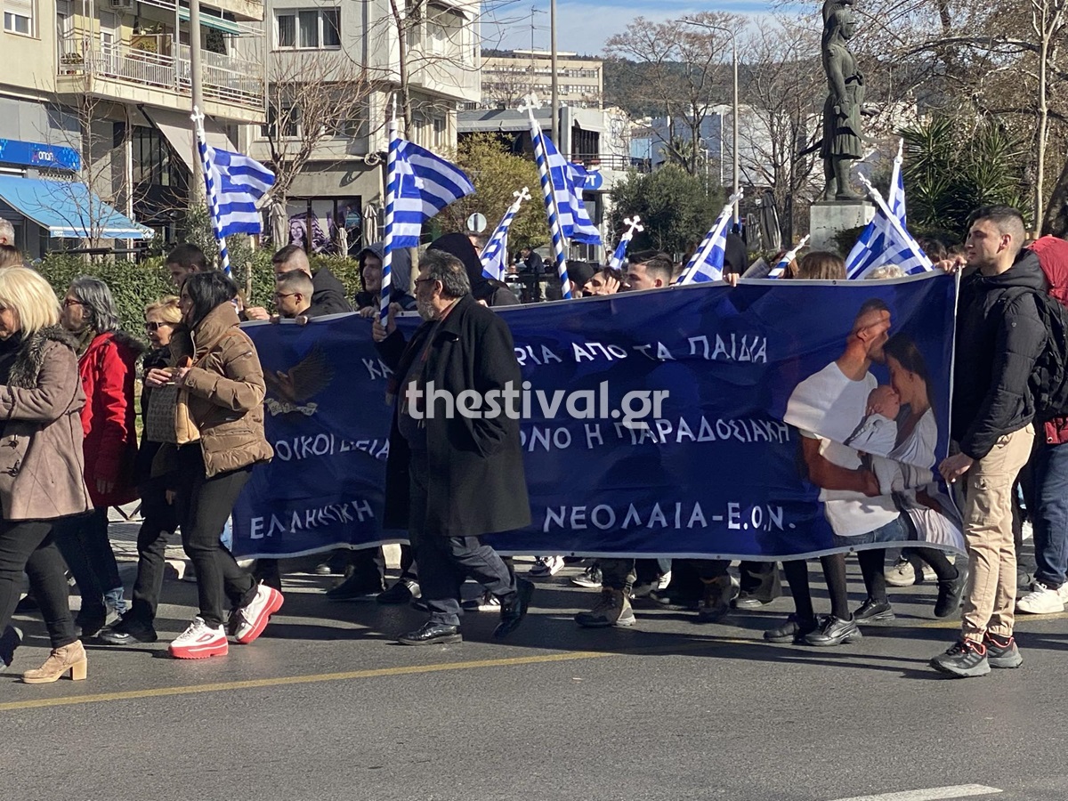Σε εξέλιξη βρίσκεται πορεία διαμαρτυρίας κατά του νομοσχεδίου για το γάμο ομοφυλόφιλων ζευγαριών και την τεκνοθεσία, στο κέντρο της Θεσσαλονίκης.