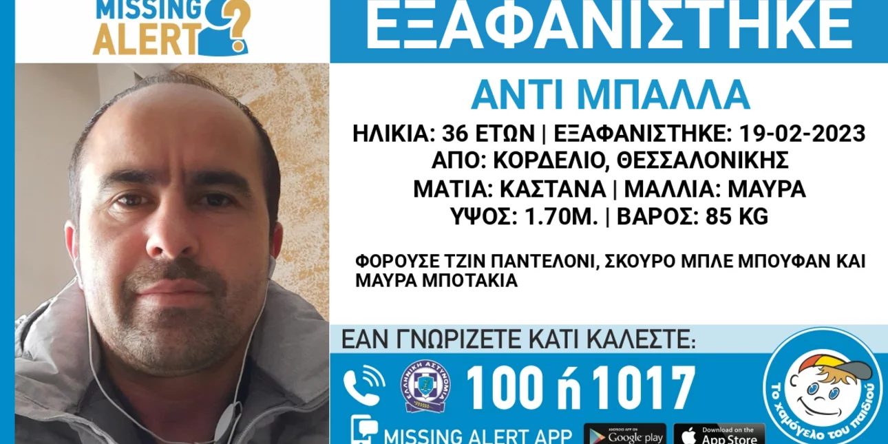 Ειδικότερα, στις 19/02, πρωινές ώρες, εξαφανίστηκε από την περιοχή του Κορδελιού Θεσσαλονίκης, ο Άντι Μπάλλα, 36 ετών, αλβανικής καταγωγής.