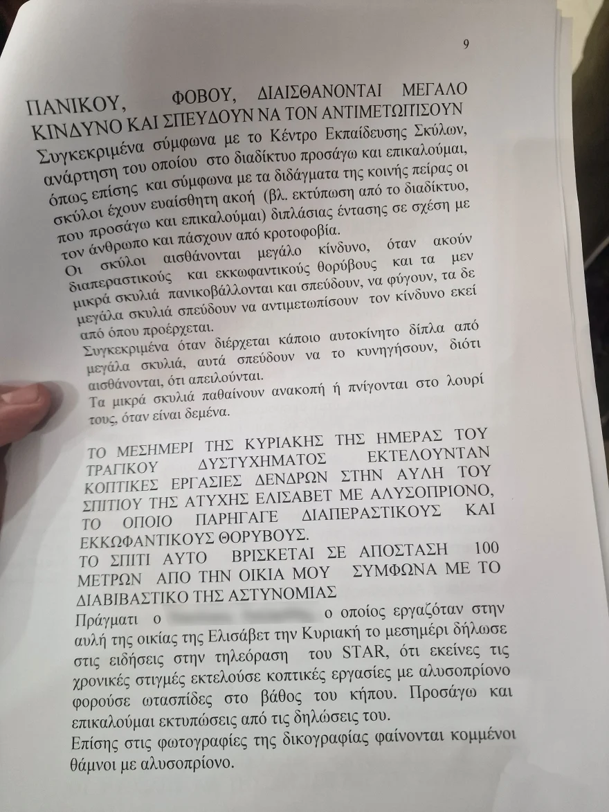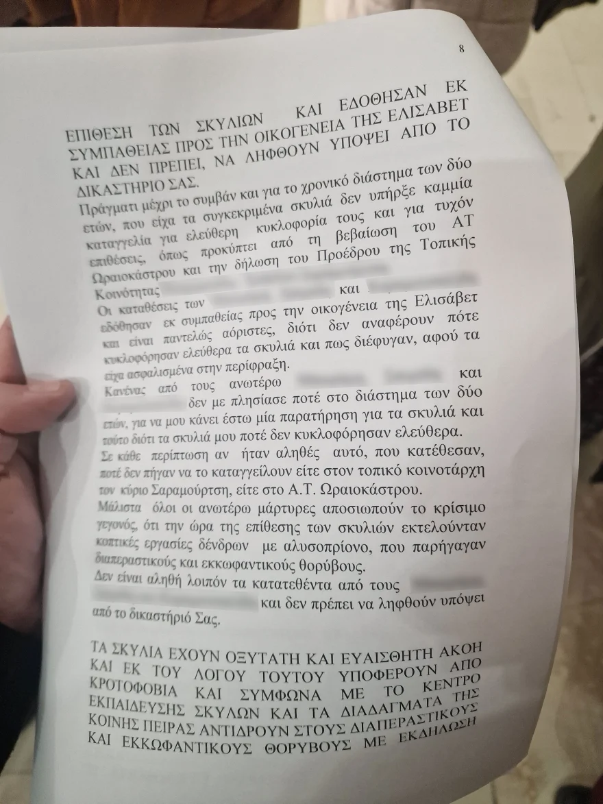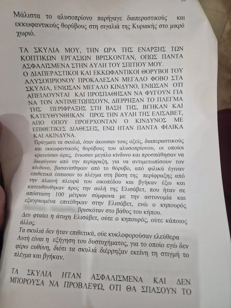 Στη συνέχεια εξηγεί ότι το μεσημέρι της Κυριακής η 50χρονη πραγματοποιούσε κοπτικές εργασίες δέντρων με αλυσοπρίονο στην αυλή του σπιτιού της που βρίσκεται σε απόσταση 100 μέτρων. Τα σκυλιά ήταν ασφαλισμένα στην αυλή, όπως υποστηρίζει και επειδή αισθάνθηκαν μεγάλο κίνδυνο διέρρηξαν το πλέγμα της περίφραξης, βγήκαν και κατευθύνθηκαν με επιθετικές διαθέσεις στην αυλή της Ελισάβετ Κουζιώρτη από όπου προερχόταν ο θόρυβος.