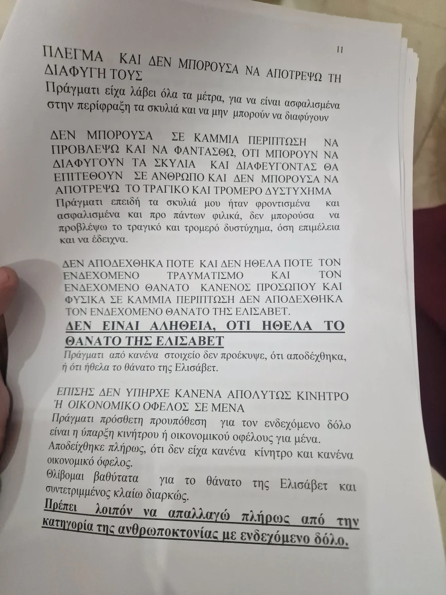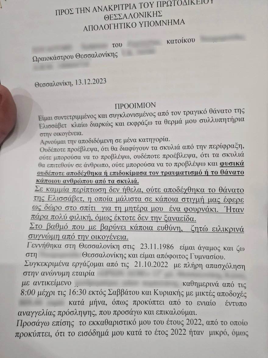 Στο απολογητικό υπόμνημα που κατέθεσε ο 37χρονος αναφέρει, μεταξύ άλλων, ότι ουδέποτε προέβλεψε ότι τα σκυλιά μπορούν να φύγουν από την περίφραξη, ότι ουδέποτε προέβλεψε ότι μπορούν να επιτεθούν σε άνθρωπο και ούτε μπορούσε να προβλέψει και να αποδεχθεί τον τραυματισμό ή τον θάνατο κάποιου ανθρώπου από τα σκυλιά.