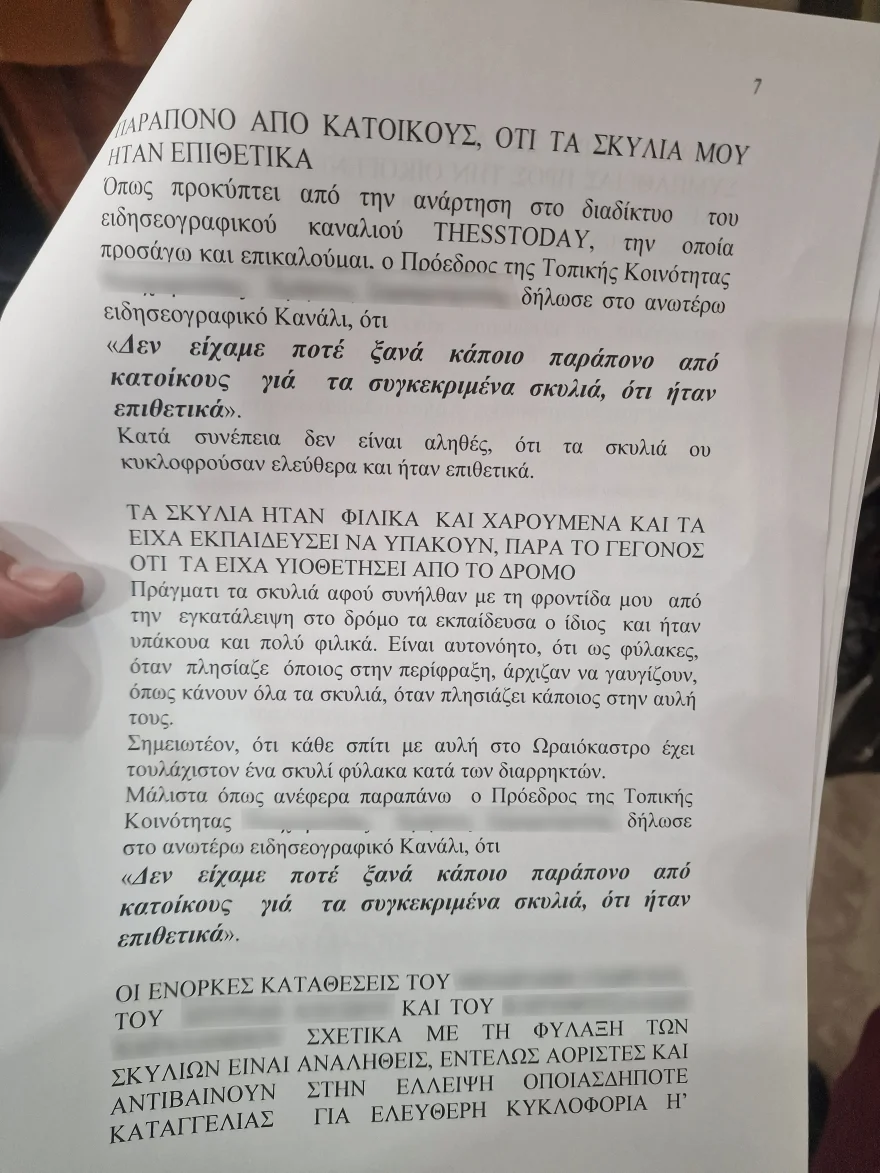 «Τα σκυλιά τα είχα φροντισμένα, ήταν επιβλεπόμενα και ασφαλισμένα στην αυλή της μονοκατοικίας μου και δεν κυκλοφορούσαν ελεύθερα. Δεν υπήρχε καμία τρύπα στο πλέγμα της περίφραξης» τονίζει και εξηγεί ότι τα είχε υιοθετήσει προ διετίας γιατί ήταν εγκαταλελειμμένα και σε κακή κατάσταση, όμως τα φρόντισε και ήταν σε καλή κατάσταση. «Από την περιποίηση έλαμπε το πλούσιο τρίχωμά τους. Τα σκυλιά είχαν δικό τους σποτάκι και κυκλοφορούσαν μόνο στην αυλή της μονοκατοικίας» αναφέρει.