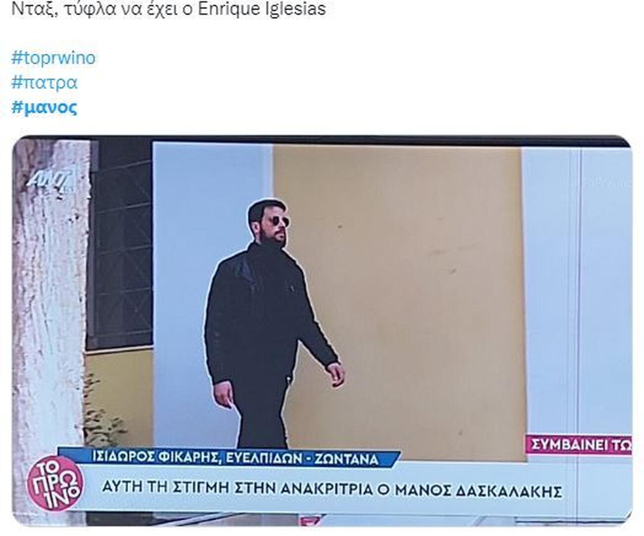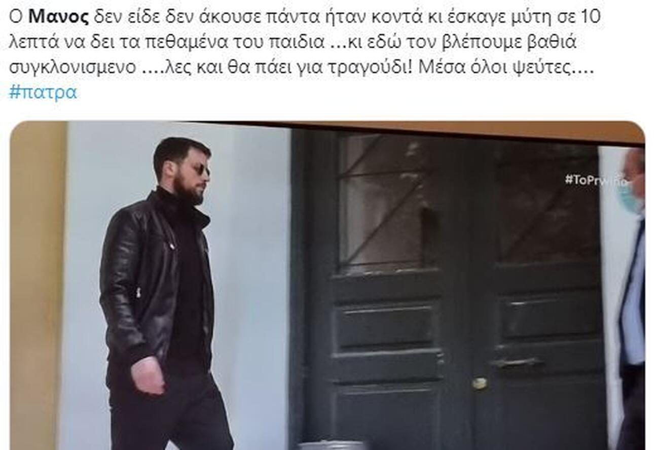 Με στυλ μοντέλου κι όχι πατέρα που έχει χάσει τρία παιδιά, κατηγορεί το Twitter τον Μάνο Δασκαλάκη, ο οποίος έφτασε στα δικαστήρια για να δηλώσει αντίδικος με τη Ρούλα Πισπιρίγκου.