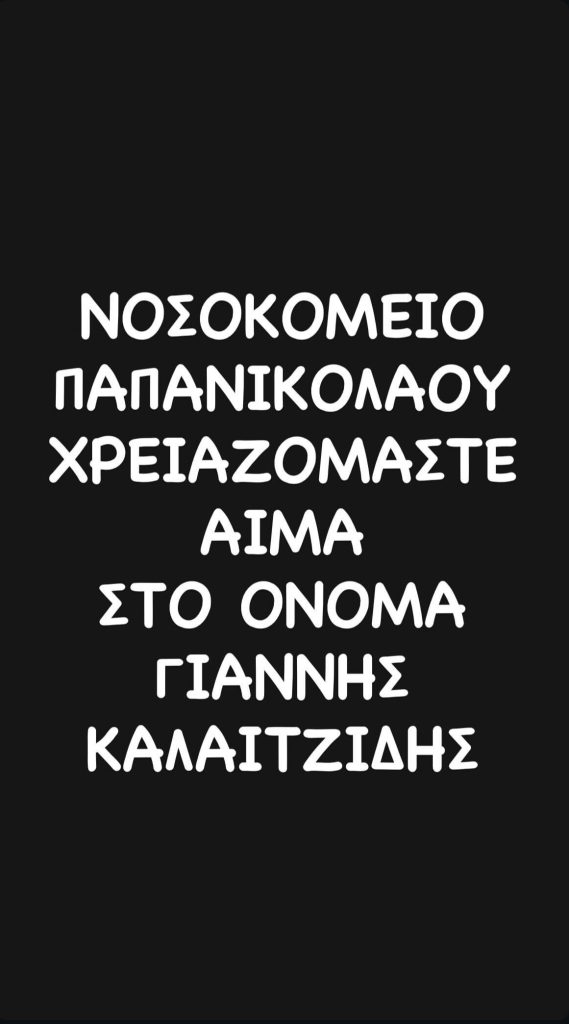 Ο σύντροφός της Γιάννης Καλαϊτζίδης, μέσα από τα κοινωνικά δίκτυα, αιτείται της βοήθειας του κόσμου, με στόχο να συγκεντρωθούν οι απαραίτητες ποσότητες αίματος στο Νοσοκομείο Παπανικολάου.
