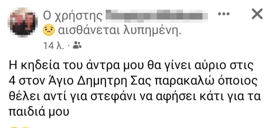 Λίγα 24ωρα μετά την αυτοχειρία του 49χρονου πατέρα η μητέρα που όπως αποκαλύπτεται κακοποιούσε τα παιδιά της, λίγο πριν την κηδεία του άνδρα της, έκανε αναρτήσεις στο λογαριασμό της στο facebook ζητώντας από τους διαδικτυακούς της φίλους να δώσουν χρήματα αντί στεφάνων. «Σας παρακαλώ όποιος θέλει αντί για στεφάνι να αφήσει κάτι για τα παιδιά μου» ήταν αυτά που είχε αναρτήσει.