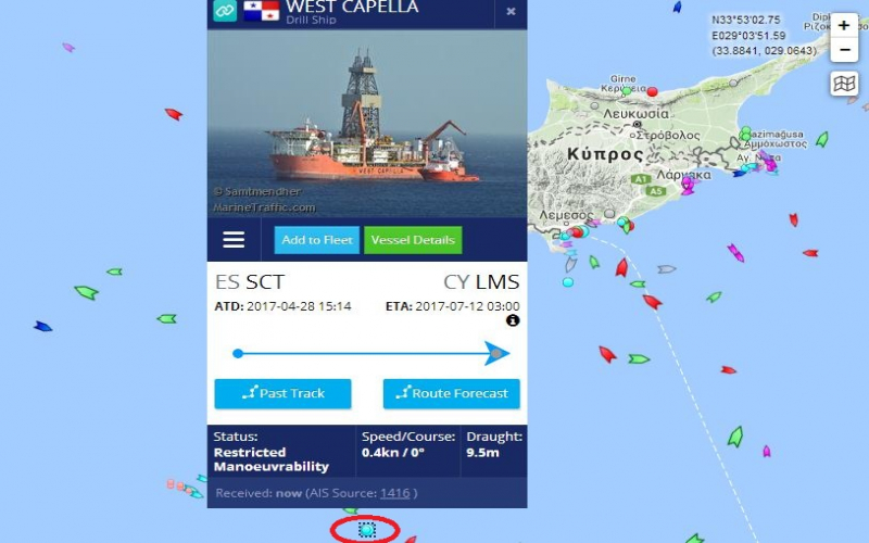 Σύμφωνα με το Marinetraffic.com η παρούσα θέση του πλωτού γεωτρύπανου μισθωμένου από τον γαλλικό ενεργειακό κολοσσό Total, “West Capella” φαίνεται στον χάρτη που ακολουθεί