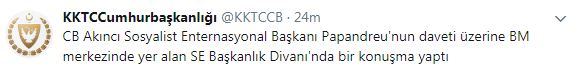 Την πρόσκληση και την συμμετοχή του στην εκδήλωση δημοσιοποίησε ο ίδιος ο κ. Ακιντζι με tweet από τον λογαριασμό της παράνομης «Προεδρίας της Τουρκικής Δημοκρατιας Βορείας Κυπρου» κάνοντας ειδική αναφορά στην προσωπική πρόσκληση από τον Γ. Παπανδρέου.
