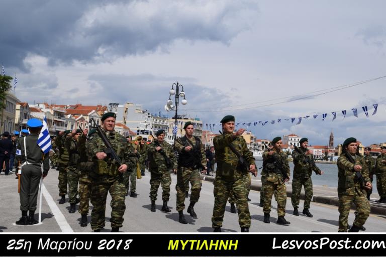 Η καθιερωμένη στρατιωτική παρέλαση για τον εορτασμό της εθνικής επετείου της 25ης Μαρτίου πραγματοποιήθηκε στη Μυτιλήνη με τον Στρατό Ξηράς όπως κάθε χρόνο να είναι παρών.