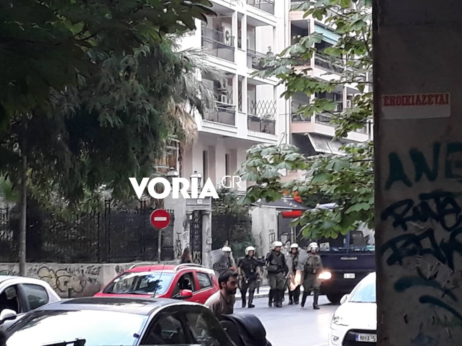 Η ένταση δημιουργήθηκε όταν άτομα που διαδήλωσαν στη περιοχή του ΙΚΕΑ για τη Μακεδονία, πέρασαν με τα οχήματά τους έξω από την κατάληξη «Σχολείο» στη οδό Βασιλέως Γεωργίου, Τότε, σημειώθηκαν αντεγκλήσεις και ακολούθησαν επεισόδια διαδηλωτών με αναρχικούς.