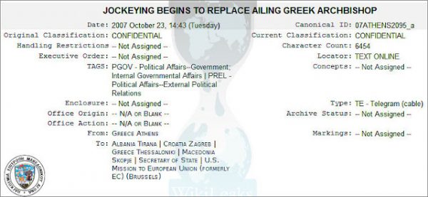 Wikileaks: «Όσο ο Χριστόδουλος είναι ζωντανός δεν περνάει το Σκοπιανό – Να επηρεάσουμε την διαδοχή του» έλεγαν οι ΗΠΑ