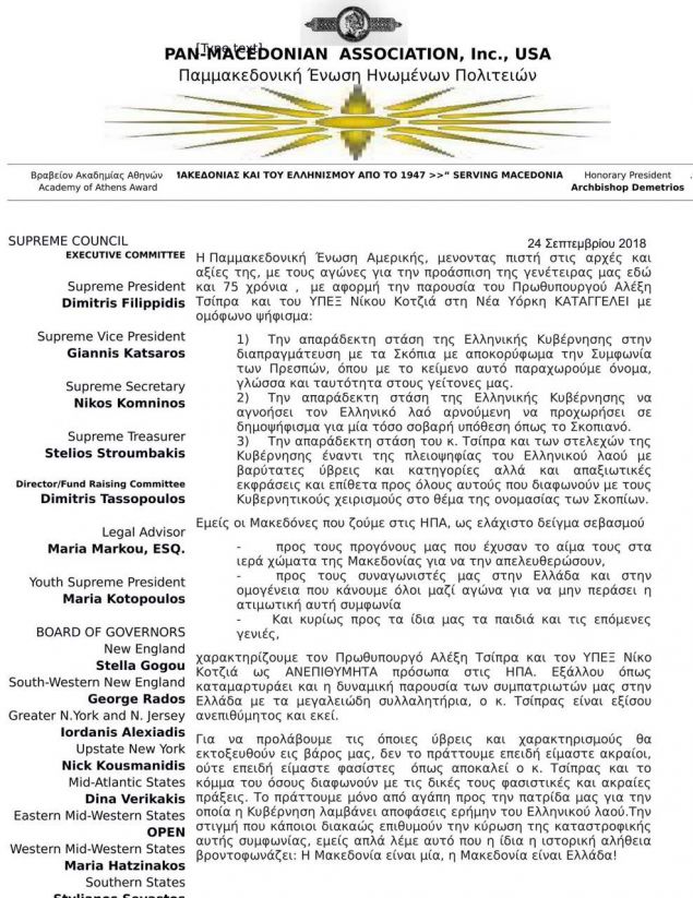 Η Παμμακεδονική Ενωση ΗΠΑ με μία ομόφωνη απόφαση χαρακτηρίζει τον Ελληνα πρωθυπουργό Αλέξη Τσίπρα και τον υπουργό Εξωτερικών Νίκο Κοτζιά ανεπιθύμητους στις ΗΠΑ.
