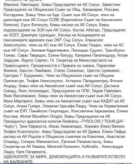 Манолис Ламтзидис, Бивш Председател на АК Солун, Заместник Председател на Общинския Съвет на Общ. Каламария, Роксани Костадзики, Бивш Член на Адв. Съвет към АК Солун, член на делегация към АК Солун CCBE (Европейски Съвет на Авокатските Колегии), Ерси Фотопулу, Бивш касиер на АК Солун, Бивш подпреседател на ЗОИ кум АК Солун, Костас Абатзас, Председател на ОСЕТ, Димитрис Целюдис, Касиер на Асоциацията на пенсионерите адвокати към ОКР. Съд Солун, Атанасиос Алексопулос, член на АС към АК Солун, Елиас Гиндис, член на АС към АК Солун, Зеновия Кадигианаки, Леонидас Сдукос, Трасибулос Тзикас, Савас Тавридис, Елени Кипуру, Катерина Папатеодору, Аглая Зордуми, Йоргос Сарлис, Гл. Секретар на Министерството на Правосъдието, Прозрачността и Правата на човека, Параскеви Филипи, Христос Ламбакис, Статис Сиямелис, Христос Циямелис, Григорис Г. Едирнелис, Член на Общинския съвет на Община Ореокастро, Теофил Алексопулос, Астериос Пападимитриу Фотини Ахциду, Бивш член на Авокатския съвет към АК Солун, Деспина Скенду, Янис Антониадис, Председател на OПИ, Лидия Павлович, Янис Василакакис, Бивш член на Авокатския съвет към АК Солун, Махи Маргарити, Бивш член на Авокатския съвет към КАДИТ на АК Солун, Атина Гуляри, Олимпия Хрисафи-Лациу, Член на Управителния съвет на ЕЯТ, Панайотис Георгиадис, Константина Харизанова, Елена Костова, Ahmet Müsellem Görgün, Бивш Председател на АК Президентът адвокатска колегия Redestou –TYROLOIS («TEKIR-ДАГ-Чорлу»), Тани Каракоста, Илиас Аманатидис, Кириаки (Кики) Велики, Теофил Ксантопулос, бивш Председател на АК Драма, Елени Лафци, касиер на АК Родопи и Общински съветник на Комотини, Анастасия Спириду, Сотирис Маликентзос, Евгения Папанастасиу, бивш Секретар на АК Кавала, Мелетий Колиняти, Kolliniatis , Aлександра Лациу, Катя Пагарлиота,.