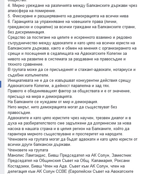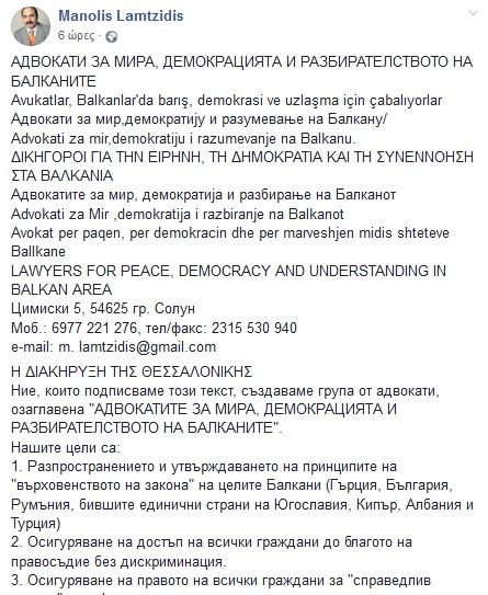 Ние, които подписваме този текст, създаваме група от адвокати, озаглавена «АДВОКАТИТЕ ЗА МИРА, ДЕМОКРАЦИЯТА И РАЗБИРАТЕЛСТВОТО НА БАЛКАНИТЕ».