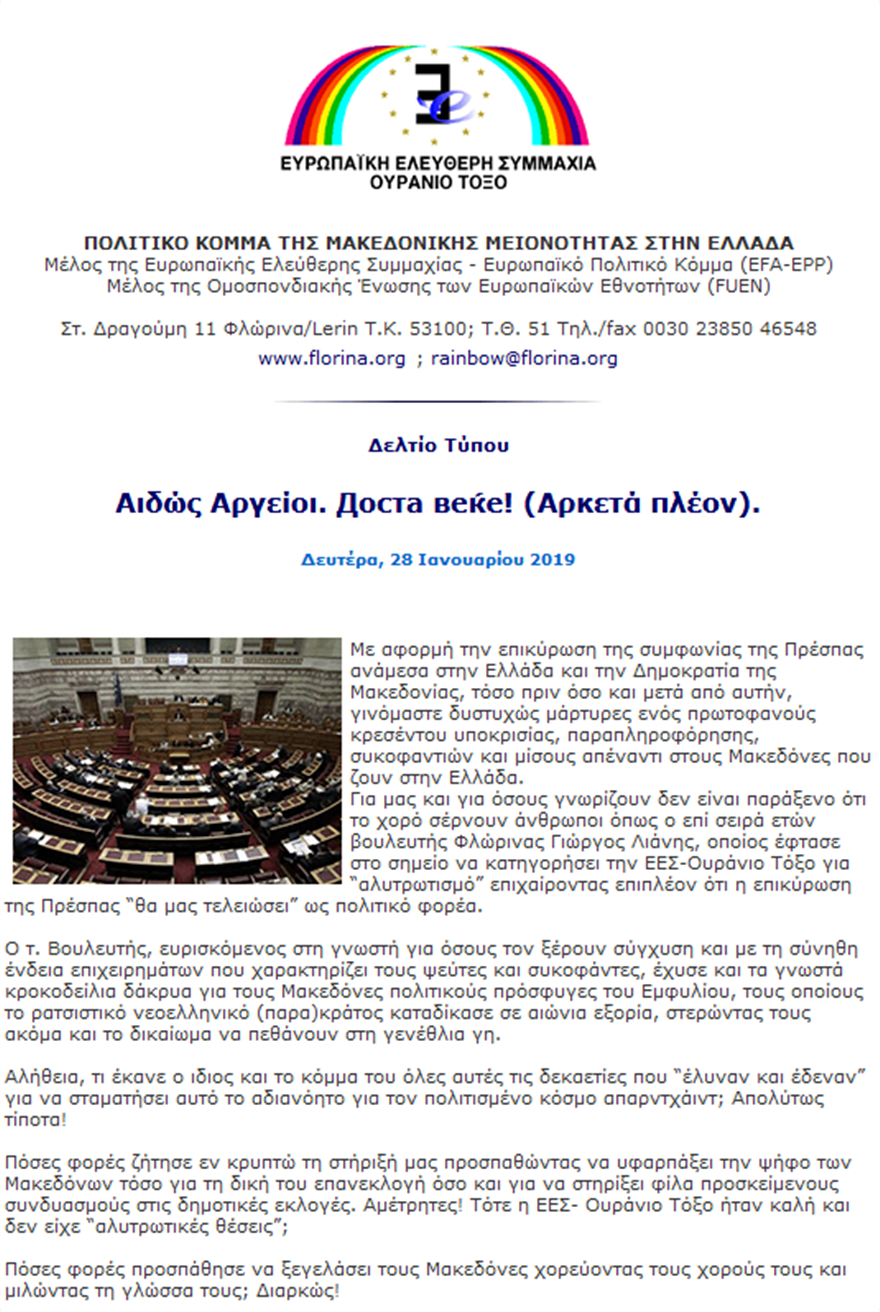 Με αφορμή την επικύρωση της συμφωνίας της Πρέσπας ανάμεσα στην Ελλάδα και την Δημοκρατία της Μακεδονίας, τόσο πριν όσο και μετά από αυτήν, γινόμαστε δυστυχώς μάρτυρες ενός πρωτοφανούς κρεσέντου υποκρισίας, παραπληροφόρησης, συκοφαντιών και μίσους απέναντι στους Μακεδόνες που ζουν στην Ελλάδα. Για μας και για όσους γνωρίζουν δεν είναι παράξενο ότι το χορό σέρνουν άνθρωποι όπως ο επί σειρά ετών βουλευτής Φλώρινας Γιώργος Λιάνης, οποίος έφτασε στο σημείο να κατηγορήσει την ΕΕΣ-Ουράνιο Τόξο για “αλυτρωτισμό” επιχαίροντας επιπλέον ότι η επικύρωση της Πρέσπας “θα μας τελειώσει” ως πολιτικό φορέα.