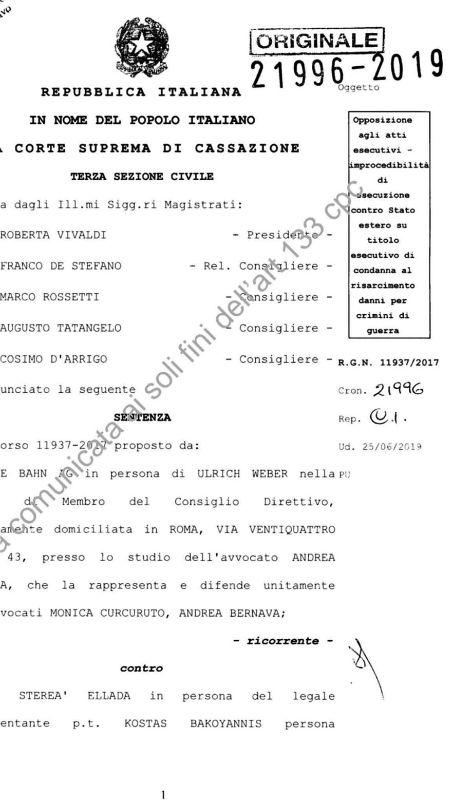 Συγκεκριμένα, το δικαστήριο άναψε το πράσινο φως, στο να κατασχεθούν οι εισπράξεις από τα εισιτήρια των Ιταλικών σιδηροδρόμων, στα οποία είχε μερίδιο και ο γερμανικός σιδηρόδρομος, καθώς κάποιες γραμμές του ανήκουν.