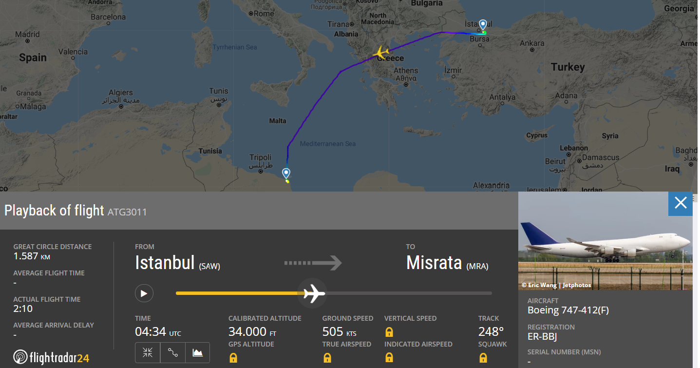 Σύμφωνα με τον Γερμανό δημοσιογράφο Julian Röpcke της BILD, μεταφορικό αεροσκάφος BOEING 747-400 το οποίο απογειώθηκε σήμερα τα ξημερώματα από την Κωνσταντινούπολη, και διέσχισε σχεδόν όλη την ηπειρωτική Ελλάδα(!) μετέφερε όπλα και πυρομαχικά στην Μισράτα για να ενισχύσει τους φιλότουρκους ισλαμιστές της Τρίπολης.