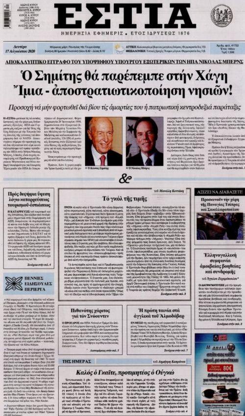 Η «ΕΣΤΙΑ» μετά και τις τελευταίες αρνητικές για την χώρα μας διπλωματικές εξελίξεις –ΗΠΑ και Γερμανία μας πιέζουν για εφ’ όλης της ύλης διάλογο με την Τουρκία υπό τις απειλές της γειτονικής χώρας για αποχώρηση από το ΝΑΤΟ– επικεντρώνει σήμερα την προσοχή της σε ένα «άγνωστο» στο ευρύ κοινό τηλεγράφημα του πρώην πρέσβη των ΗΠΑ στην Αθήνα Νίκολας Μπερνς, ο οποίος είναι συχνός συνομιλητής του Πρωθυπουργού Κυριάκου Μητσοτάκη και θέτει σοβαρή υποψηφιότητα για υπουργός Εξωτερικών των ΗΠΑ αν επικρατήσουν οι Δημοκρατικοί.