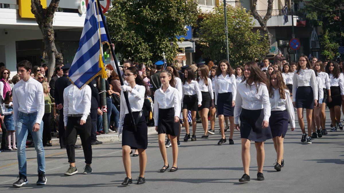 Στη σκιά της τραγωδίας των Τεμπών, κάποια από τα παιδιά που παρέλασαν φορούσαν μαύρα περιβραχιόνια και μαύρα μαντήλια.