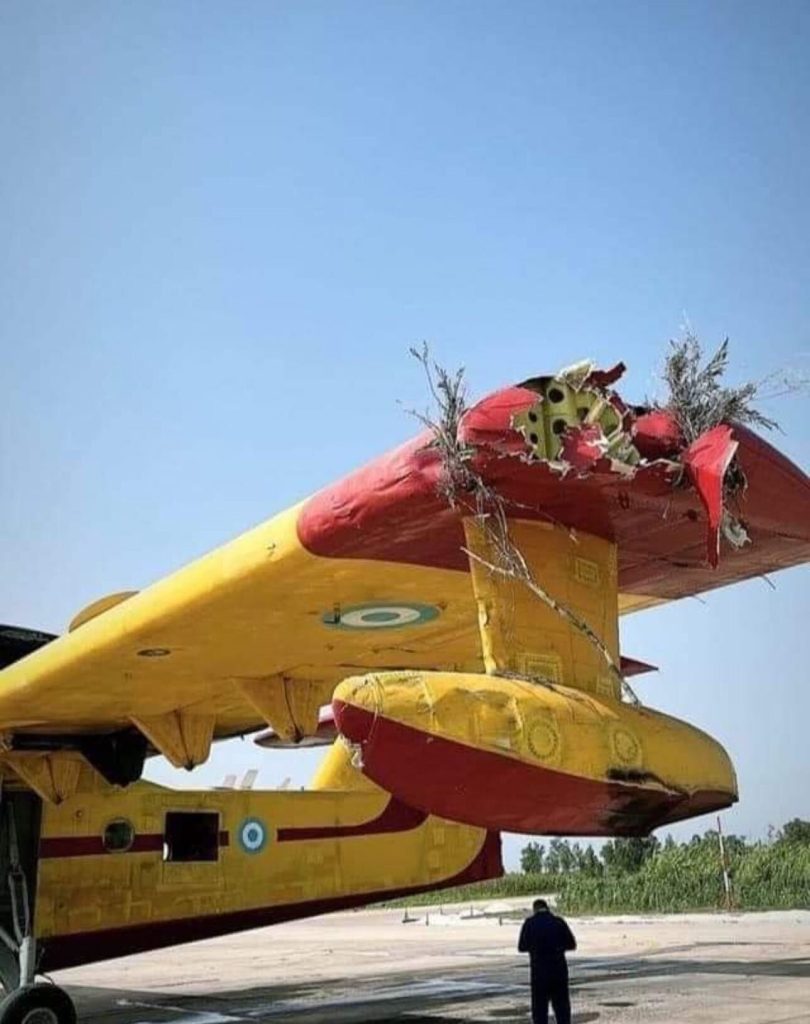Στη φωτογραφία διακρίνεται το ακροπτερύγιο του Canadair, ωστόσο από το χτύπημα δεν επηρεάστηκαν οι επιφάνειες ελέγχου του αεροσκάφους με τους χειριστές να συνεχίζουν την πορεία τους.