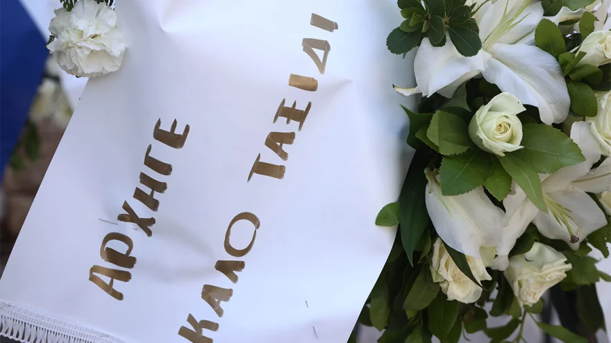 «Αρχηγέ καλό ταξίδι», γράφουν μερικά από τα δεκάδες στεφάνια που έχουν κατακλύσει τον ναό, ενώ στην είσοδό του υπάρχει το στεφάνι της συζύγου του.