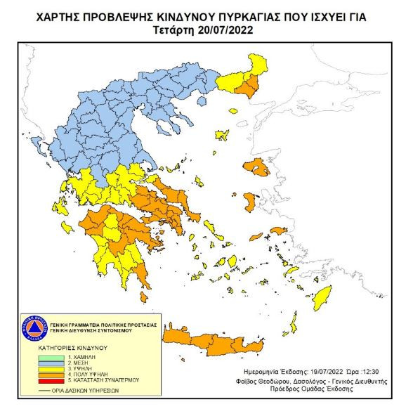 Σύμφωνα με το χάρτη πρόβλεψης κινδύνου πυρκαγιάς που εκδίδει η Γενική Γραμματεία Πολιτικής Προστασίας του υπουργείου Κλιματικής Κρίσης & Πολιτικής Προστασίας, για αύριο Τετάρτη 20 Ιουλίου, προβλέπεται πολύ υψηλός κίνδυνος πυρκαγιάς (κατηγορία κινδύνου 4) για συγκεκριμένες περιοχές της χώρας.