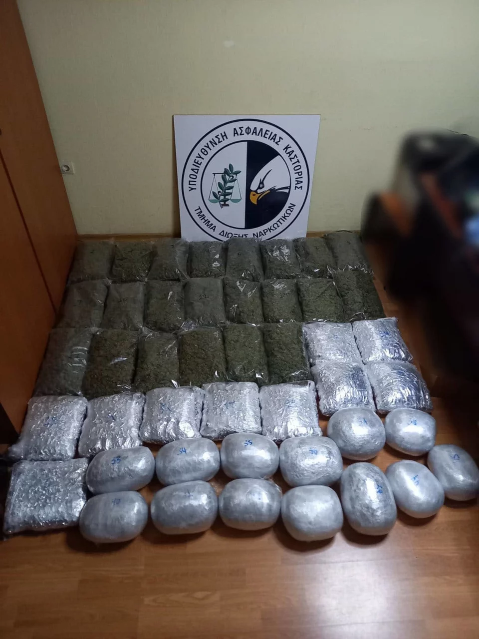 Ειδικότερα, στο πλαίσιο της σύλληψης από αστυνομικούς της Διεύθυνσης Αστυνομίας Καστοριάς κατασχέθηκαν 45 κιλά και 650 γραμμάρια ακατέργαστης κάνναβης, ένα ιδιωτικής χρήσης αυτοκίνητο, το χρηματικό ποσό των 930 ευρώ, τέσσερα κινητά τηλέφωνα και τέσσερις κάρτες sim.