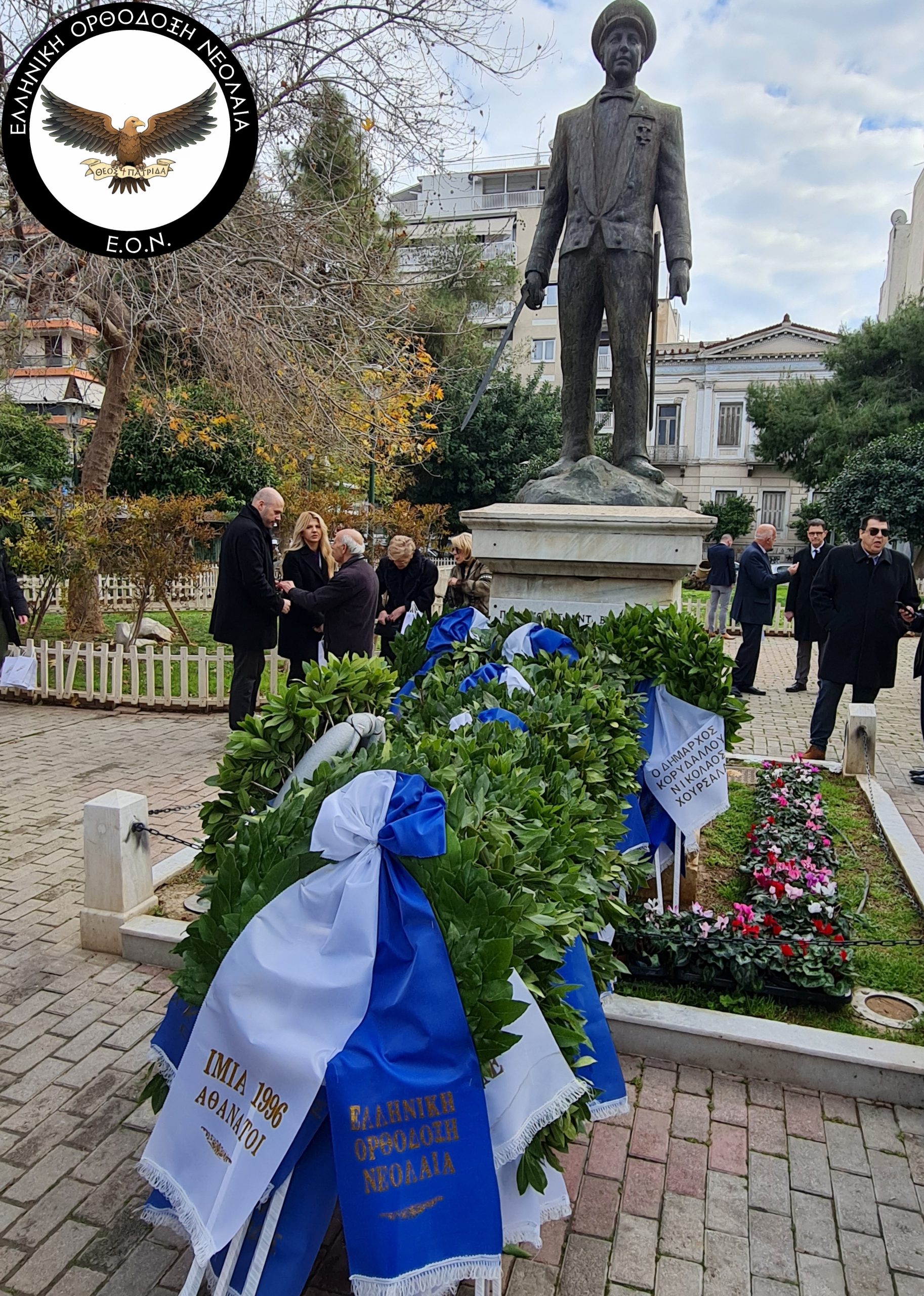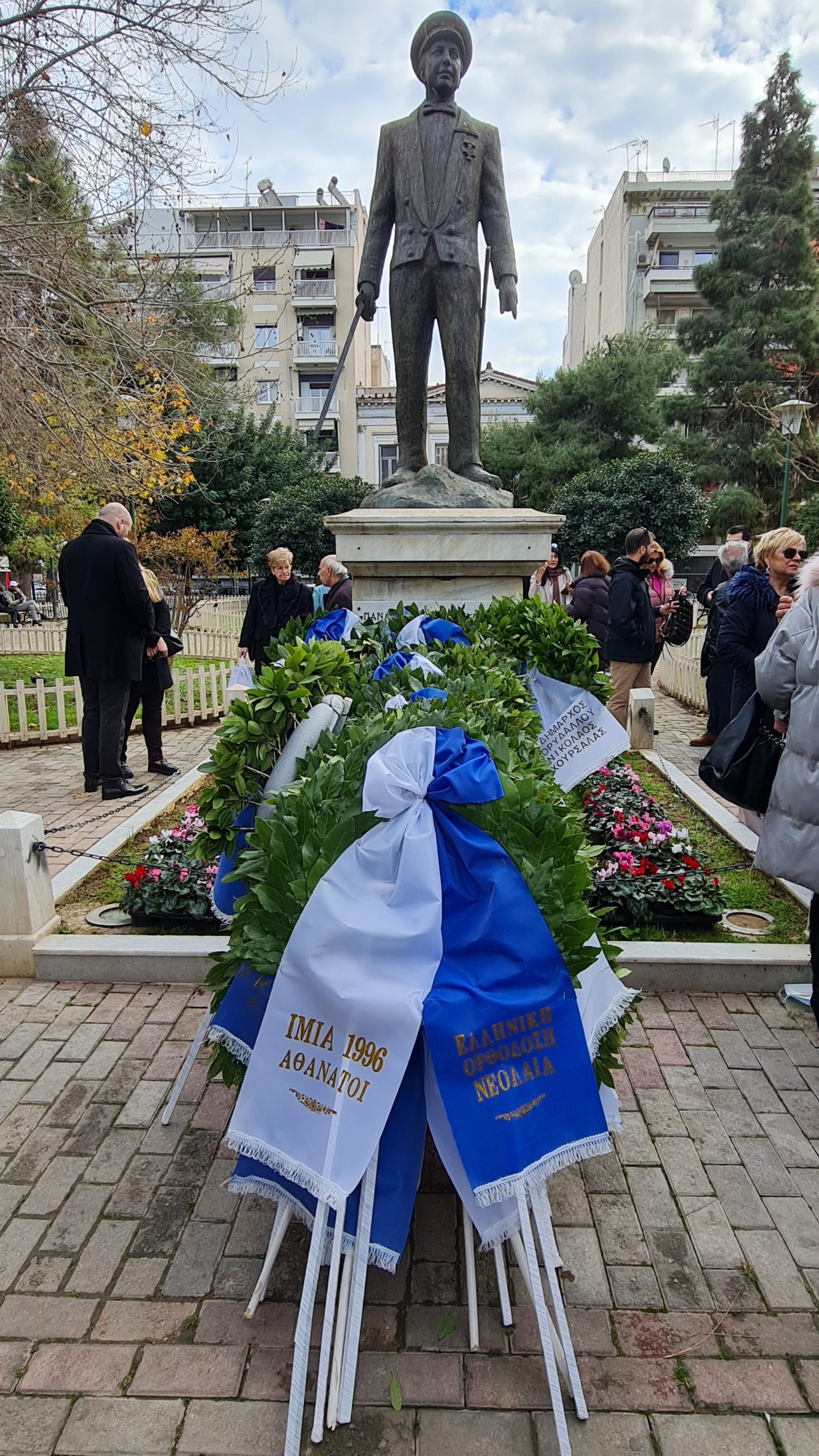 Μέλη μας με σεβασμό, δέος και ευπρέπεια κατέθεσαν σεμνώς δάφνινο στέφανο έμπροσθεν του αγάλματος του Παναγιώτη Βλαχάκου, κλίνοντας με βαθειά ευγνωμοσύνη το γόνυ στο νοερό ανάστημα εκείνων των ενδόξων παλληκαριών που έχασαν την ζωή τους για την Ελλάδα.