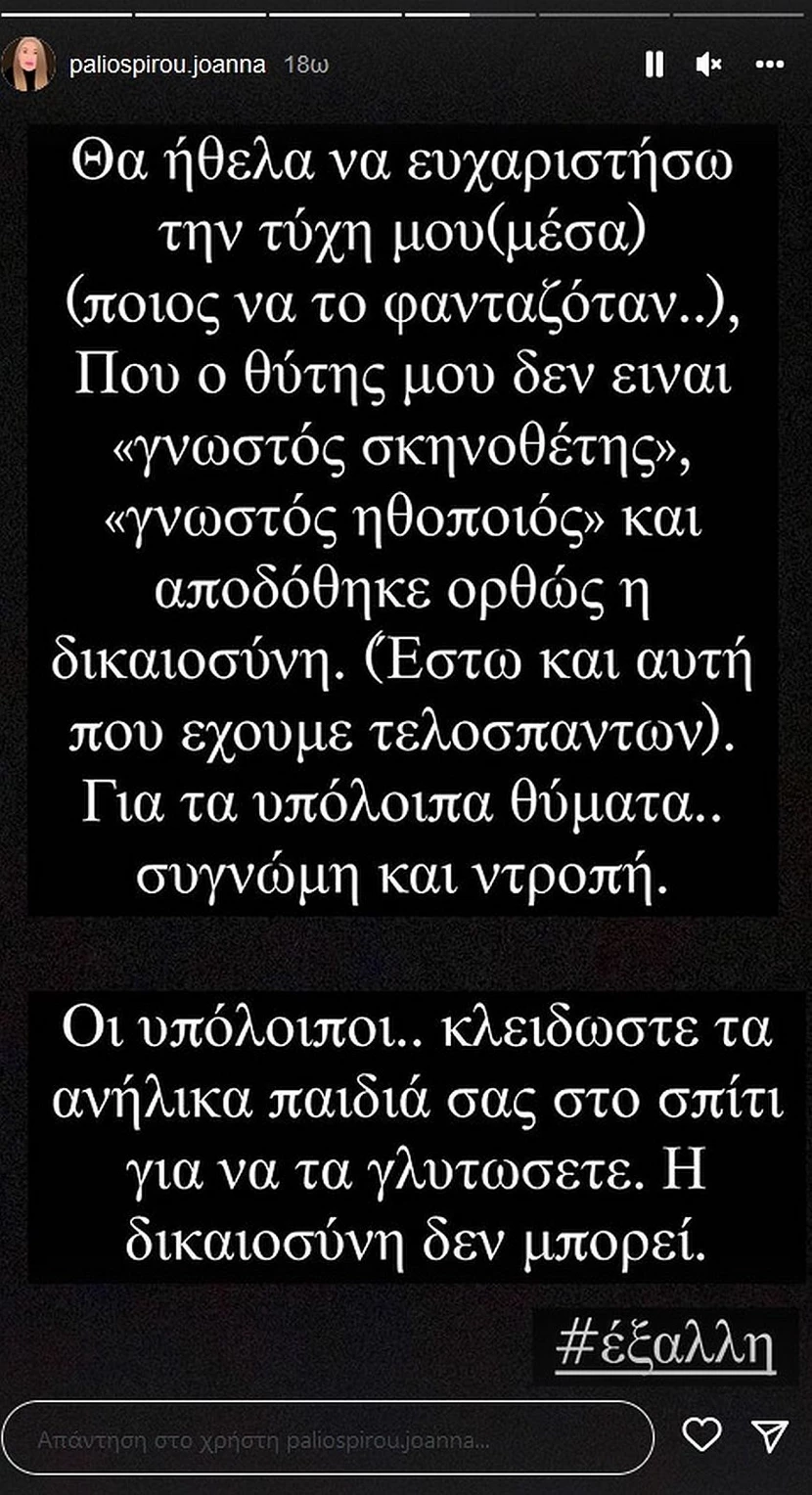 Με μία ανάρτηση στο Instagram ευχαρίστησε την ελληνική δικαιοσύνη για την απόφαση στην περίπτωσή της, ενώ «για τα υπόλοιπα θύματα, συγγνώμη και ντροπή».