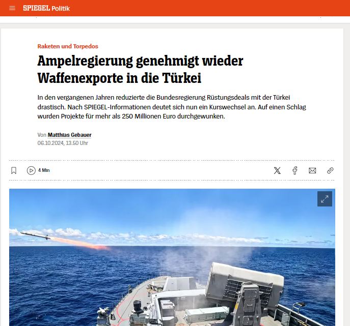 Το γερμανικό ειδησεογραφικό μέσο Spiegel, επικαλούμενο έγκυρες πληροφορίες αναφέρει σε σημερινό του δημοσίευμα(06/10) πως η Γερμανία ετοιμάζει την εξαγωγή όπλων μεγάλης κλίμακας, αξίας 336 εκατομμυρίων ευρώ προς την Τουρκία.