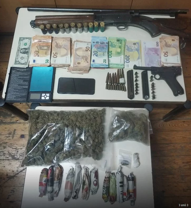 326 γραμμάρια κάνναβης, μικροποσότητα κοκαΐνης ηλεκτρονική ζυγαριά ακριβείας, πιστόλι, κυνηγητικό όπλο, 2 γεμιστήρες πιστολιού, 42 φυσίγγια διαφόρων τύπων και διαμετρημάτων, κινητό τηλέφωνο ενώ επιπλέον κατασχέθηκε το χρηματικό ποσό 20.425 ευρώ και 347 δολάρια ως προερχόμενα από παράνομες δραστηριότητες.