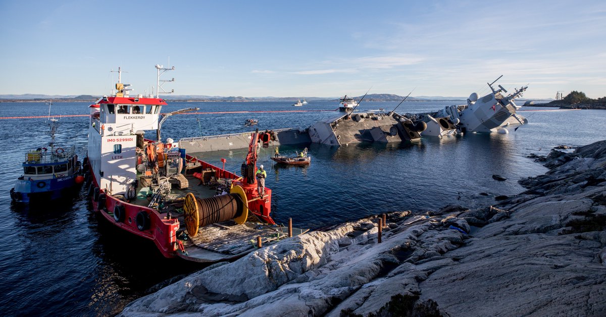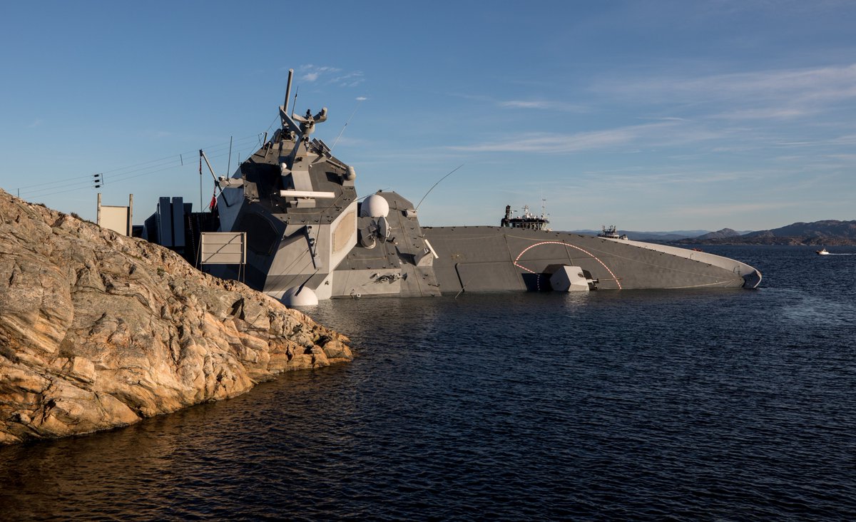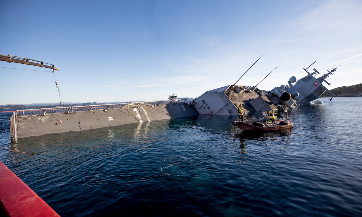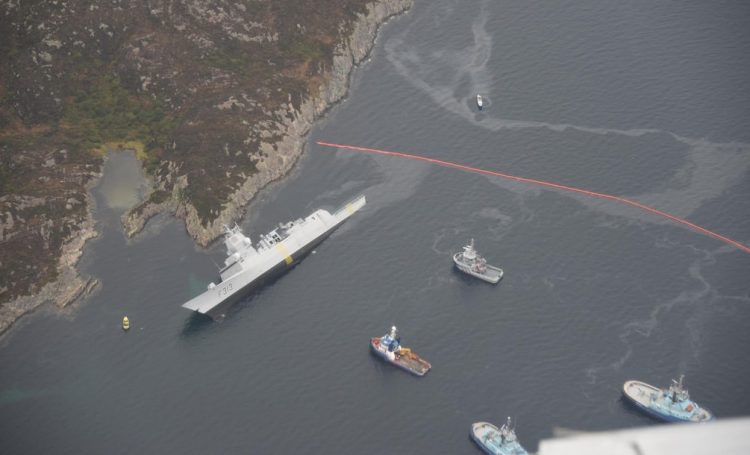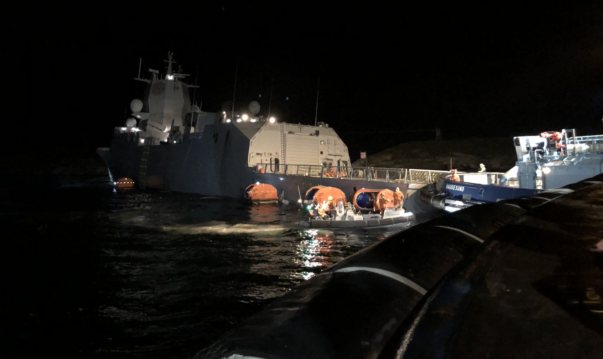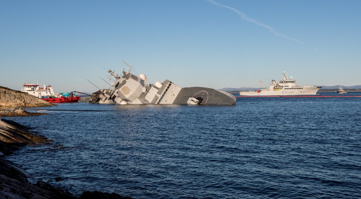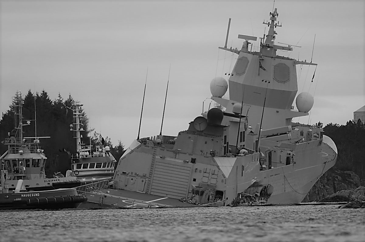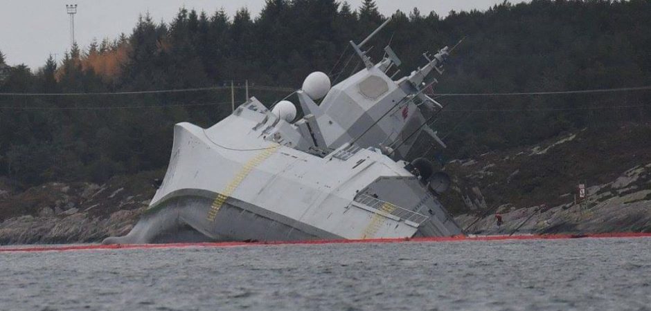 H νορβηγική φρεγάτα «αναπαύεται» μισοβυθισμένη κοντά στην ακτή όπου ρυμουλκήθηκε: