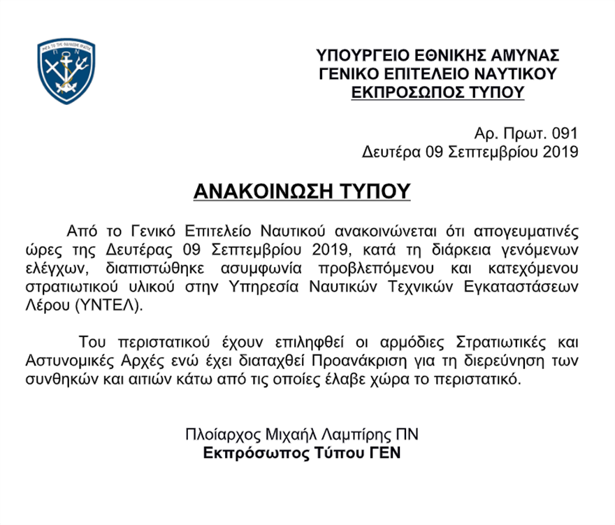 “Τις απογευματινές ώρες της Δευτέρας 09 Σεπτεμβρίου 2019, κατά τη διάρκεια γενόμενων ελέγχων, διαπιστώθηκε ασυμφωνία προβλεπόμενου και κατεχόμενου στρατιωτικού υλικού στην Υπηρεσία Ναυτικών Τεχνικών Εγκαταστάσεων Λέρου (ΥΝΤΕΛ).
