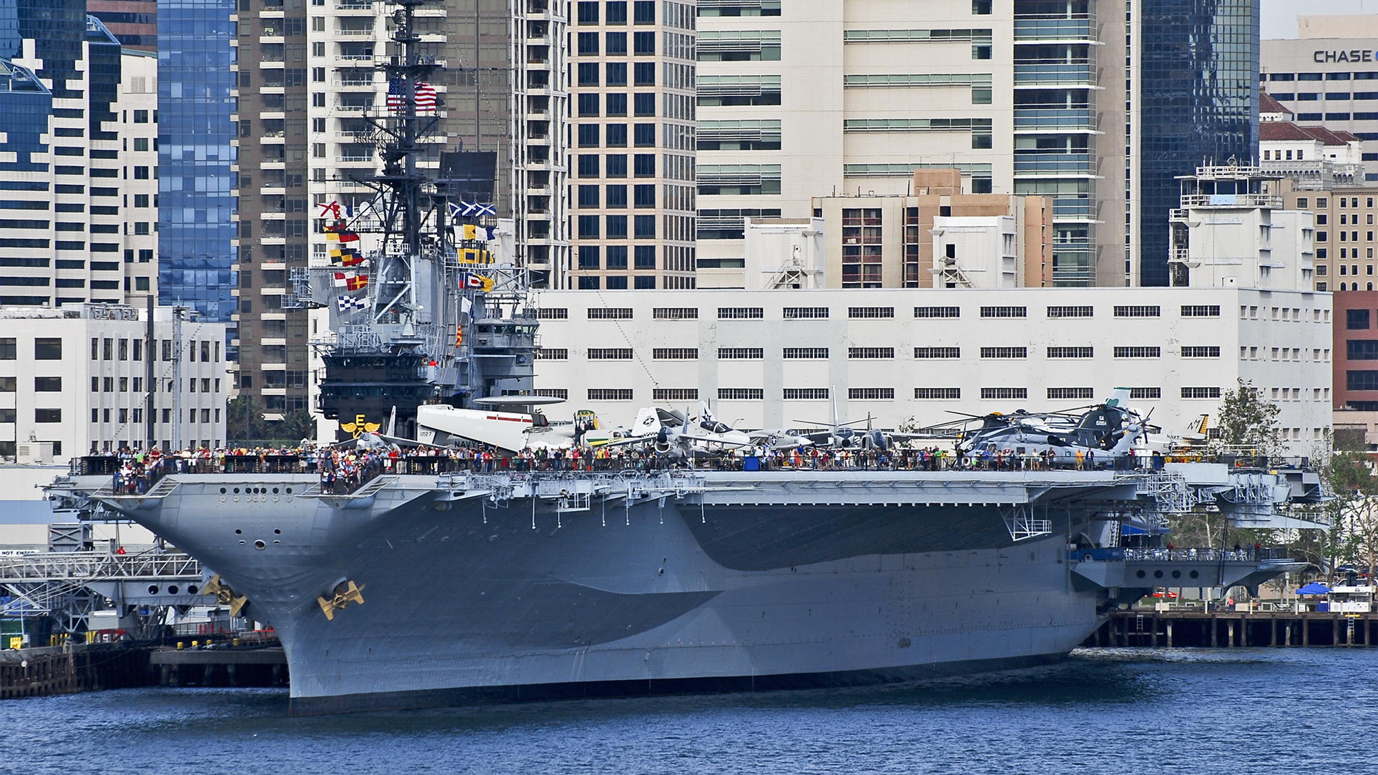 Το USS Midway ελλιμενίζεται απέναντι από τον κόλπο του Σαν Ντιέγκο από τη Ναυτική Βάση Coronado, η οποία είναι το λιμάνι όπου βρίσκονται τρία σημερινά πυρηνικά αεροπλανοφόρα του Ναυτικού των ΗΠΑ και ένας μεγάλος αριθμός μοίρας αεροσκαφών του Ναυτικού των ΗΠΑ.