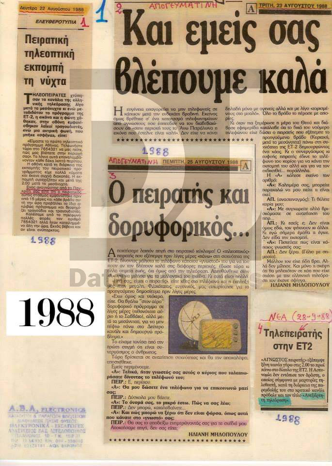 Μεταξύ 1988 και 1989, ένα πειρατικό κανάλι που εξέπεμπε μετά τα μεσάνυχτα, «πάνω» στη συχνότητα της κρατικής ΕΤ 2, κρατούσε ξάγρυπνη την Ελλάδα.