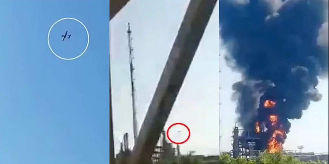 Στις εικόνες διακρίνεται το drone «καμικάζι» να πέφτει πάνω σε εγκαταστάσεις του διυλιστηρίου προκαλώντας μια τεράστια έκρηξη, που ακούστηκε σε απόσταση δεκαπέντε χιλιομέτρων!