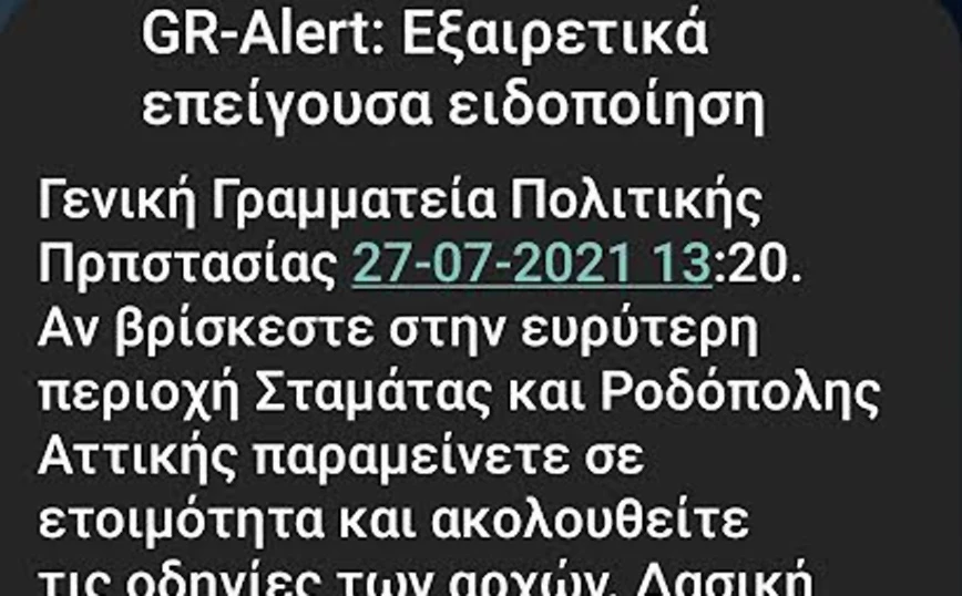 «Αν βρίσκεστε στην ευρύτερη περιοχή Σταμάτας και Ροδόπολης Αττικής παραμείνετε σε ετοιμότητα και ακολουθείτε τις οδηγίες των Αρχών»