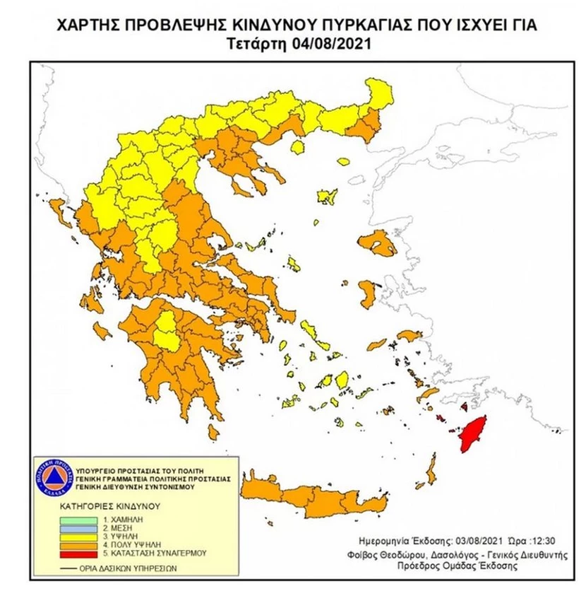 Η Γενική Γραμματεία Πολιτικής Προστασίας του Υπουργείου Προστασίας του Πολίτη, επισημαίνει στον σχετικό της Χάρτη Πρόβλεψης Κινδύνου Πυρκαγιάς, πως για σήμερα Τετάρτη 4 Αυγούστου, προβλέπεται ακραίος κίνδυνος πυρκαγιάς στη Ρόδο.
