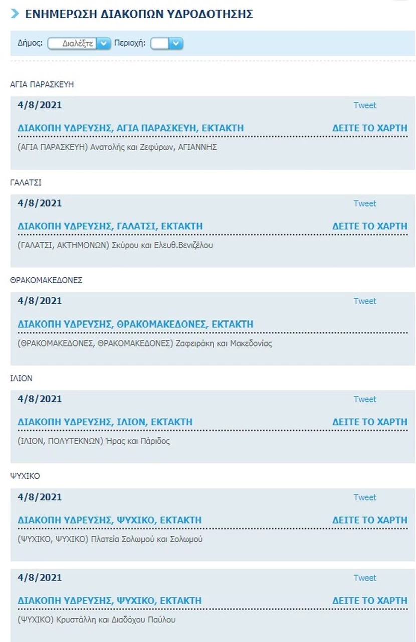 Οι διακοπές νερού αφορούν τις περιοχές της Αγίας Παρασκευής, του Γαλατσίου, των Θρακομακεδόνων, του Ιλίου και του Ψυχικού. Σύμφωνα με την εταιρεία το νερό αναμένεται να επανέλθει μεταξύ 11:00 και 13:00.