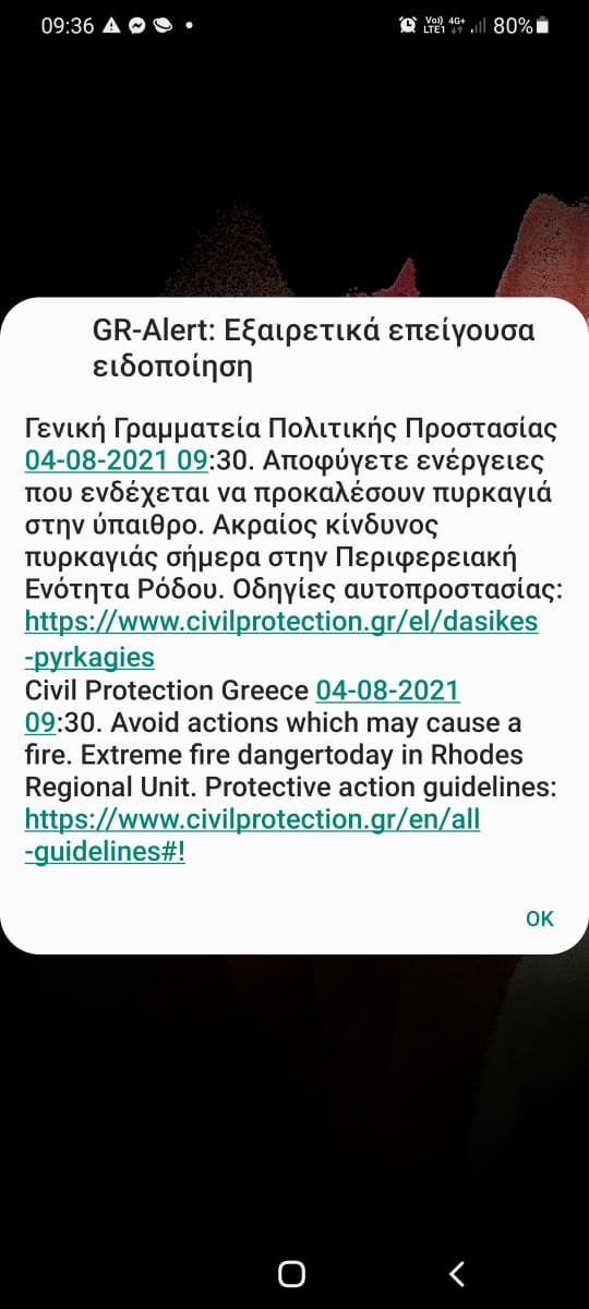 Οι κάτοικοι της Ρόδου και της Κρήτης έλαβαν σήμερα το πρωί μήνυμα από το 112, στο οποίο η Πολιτική Προστασία προειδοποιεί τον κόσμο να αποφύγει ενέργειες που ενδέχεται να προκαλέσουν πυρκαγιά στην ύπαιθρο.