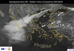 Πιο συγκεκριμένα, φαίνεται η μεταφορά του καπνού πάνω από το Βόρειο και Κεντρικό Αιγαίο από τις δασικές πυρκαγιές σε Έβρο και Ροδόπη, καθώς και από την πυρκαγιά πάνω από τη Βοιωτία.