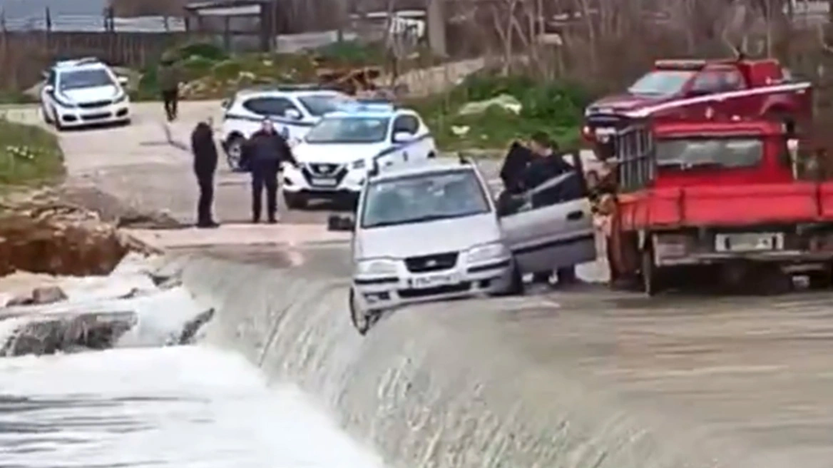 Όπως φαίνεται σε βίντεο, το αυτοκίνητο κοντεύει να παρασυρθεί από τα ορμητικά νερά, ενώ δίπλα του βρίσκεται ένα κόκκινο φορτηγάκι και προσπαθούν να βγάλουν τον οδηγό.