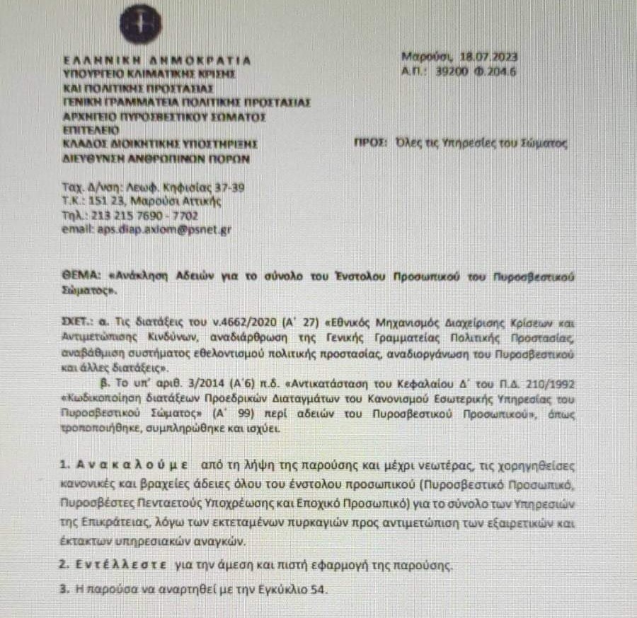 Πρακτικά αυτό σημαίνει ότι όλα τα στελέχη της Πυροσβεστικής πρέπει να παρουσιαστούν στην υπηρεσία τους το συντομότερο δυνατό.