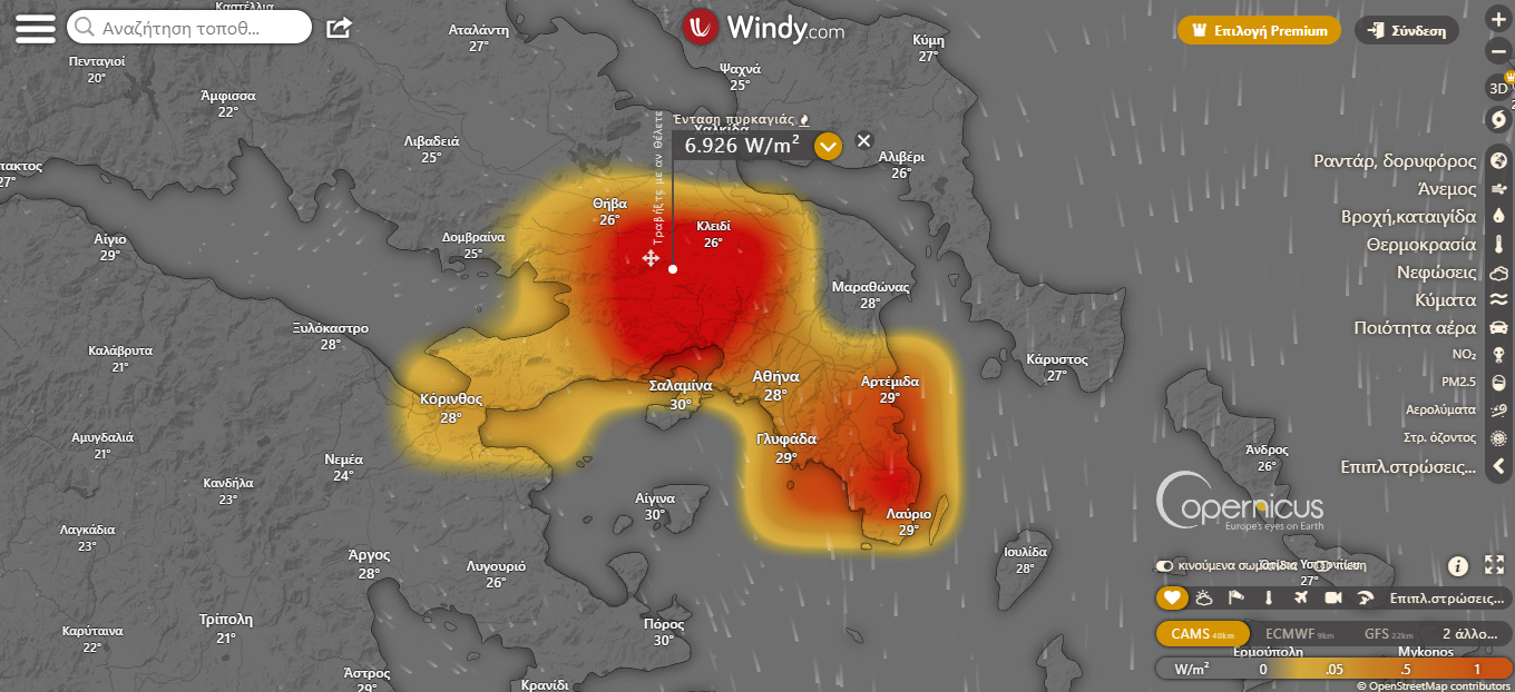 Το Windy, δίνει τη δυνατότητα να «χαρτογραφήσουμε» τις περιοχές όπου μαίνονται οι πυρκαγιές.