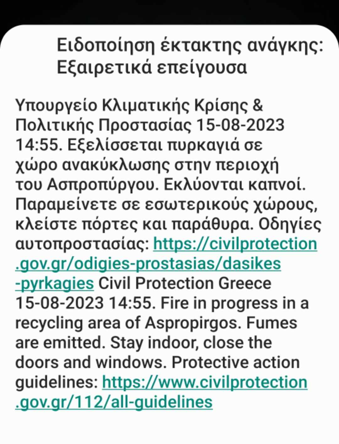 Να σημειωθεί πως στις 15:15 στάλθηκε μήνυμα από το «112» στους κατοίκους της Αττικής, να κλείσουν πόρτες και παράθυρα λόγω των καπνών.