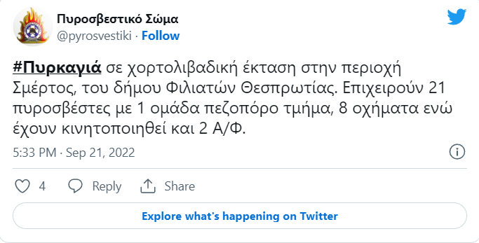 Για την κατάσβεσή της, επιχειρούν 21 πυροσβέστες με 1 ομάδα πεζοπόρο τμήμα, 8 οχήματα ενώ έχουν κινητοποιηθεί και 2 Α/Φ.