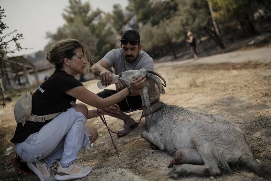 Κάτοικοι αλλά και εθελοντές κρατούν στην αγκαλιά τους ζωάκια προκειμένου να τα απομακρύνουν από τις φλόγες και να τα σώσουν από την πύρινη λαίλαπα.