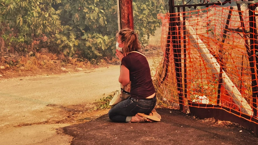 Ανατριχιαστική είναι και η εικόνα της γυναίκας που βλέπει το σπίτι της να καταπίνεται από τις φλόγες στην περιοχή του Μενιδιού: